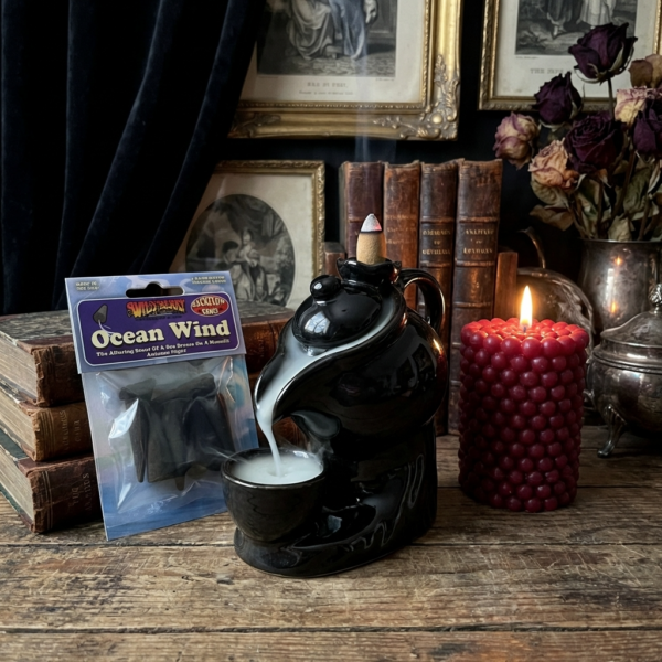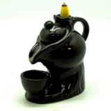 Glossy black ceramic teapot-shaped backflow burner. 5 inches tall—when a backflow cone is lit, smoke pours down from the spout in a gentle waterfall cascade, creating a calming visual and fragrant ambiance
