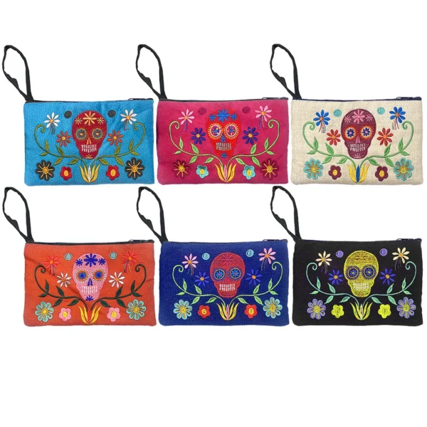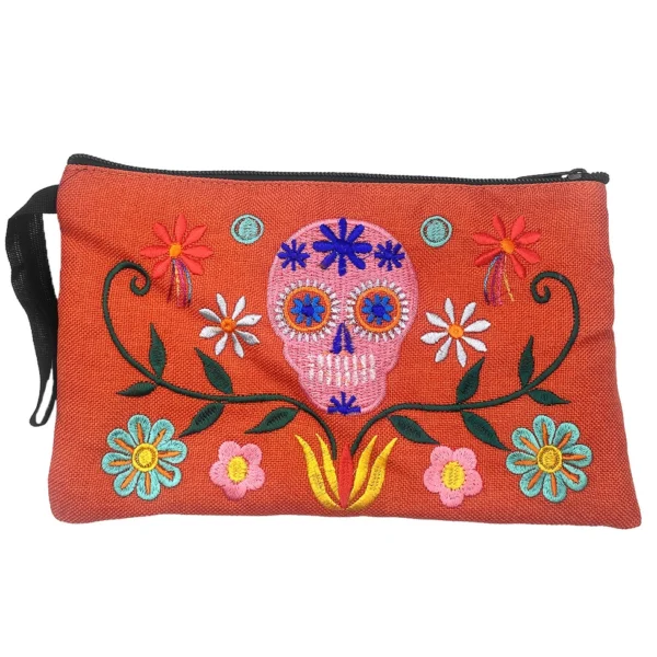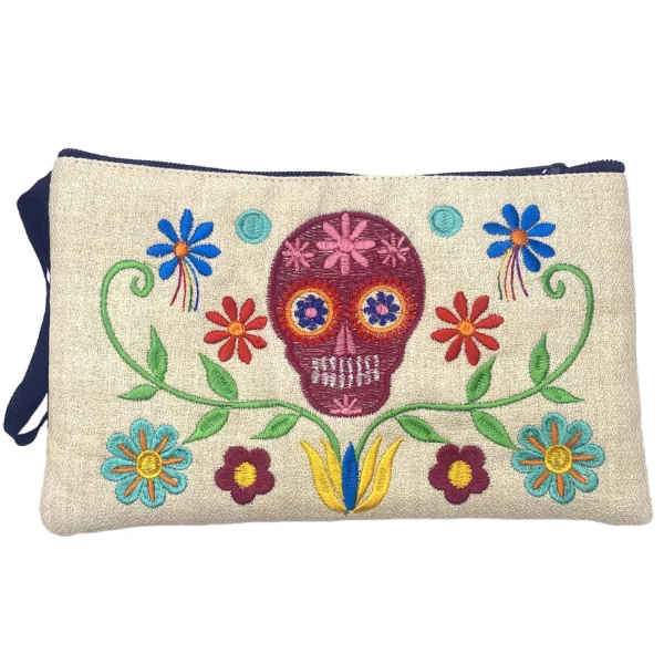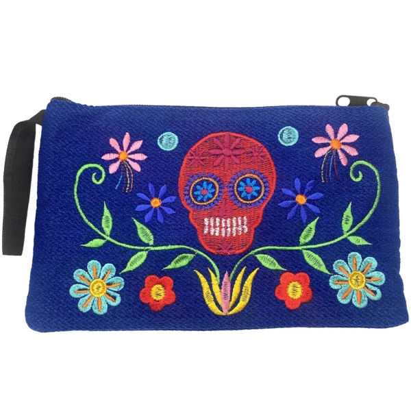 Rectangle-shaped clutch purse wristlet bag featuring a vibrant embroidered Day of the Dead sugar skull in a floral scene. Handmade in Ecuador, this slightly cushioned pouch with lightweight padding offers a wrist strap for easy carrying and a single zipper closure for security. Each wristlet is unique due to its artisanal craftsmanship and comes in assorted colors and styles.