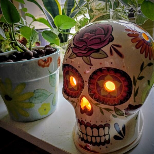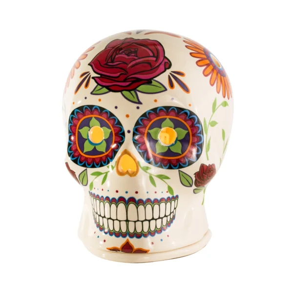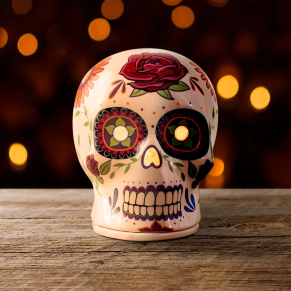 A ceramic sugar skull wax warmer with vibrant floral designs and a red rose, ideal for wax melts, with a 20-watt bulb. Perfect with our hand-made wax melts.
