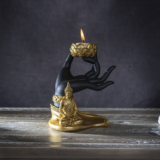 This striking cold cast resin candle holder features a serene golden Buddha seated beneath an elegant black hand in a graceful mudra, holding a golden lotus flower bowl that’s perfect for a tealight candle.