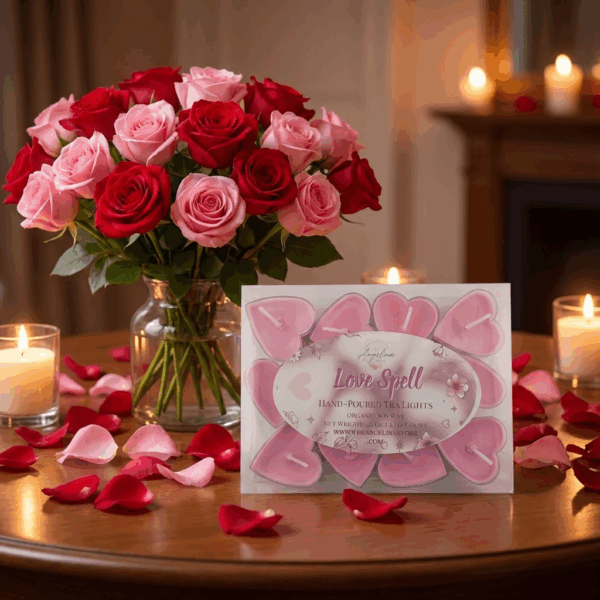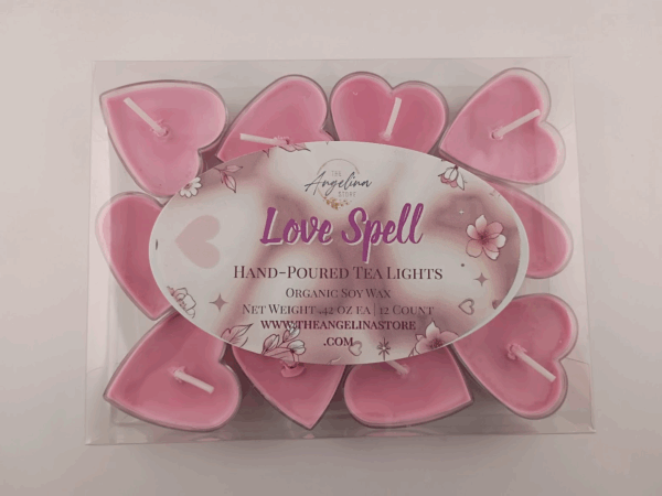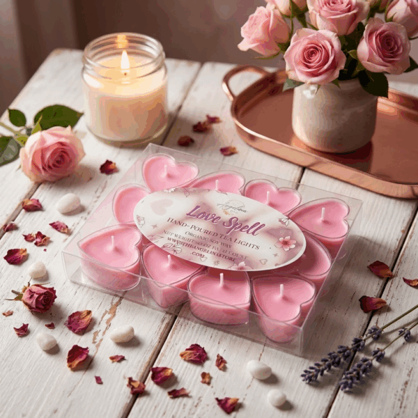 Twelve heart-shaped tea lights in enchanting Love Spell scent — the perfect romantic glow for any moment.