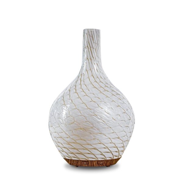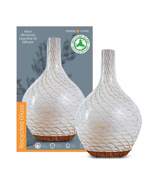 Handcrafted glass ultrasonic diffuser with Maui wave design and gold accents. 100ml capacity covers up to 400 sq ft.
