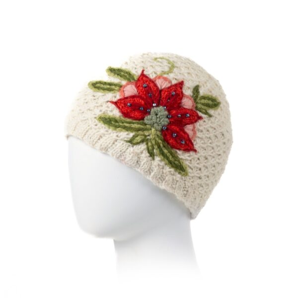 Ivory Naomi beanie from Lost Horizons with embroidered flower and blue bead details — hand-knit wool warmth with fleece-lined comfort.