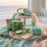 Pair it with the Oceanica Spa pillar candles, incense, wax melts, lotion bar or sugar scrub for a complete layered coastal for the full spa-at-home experience.