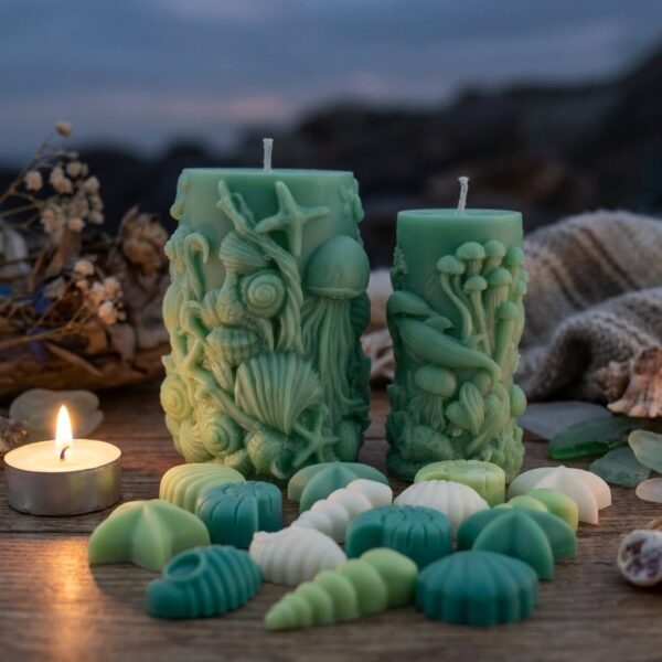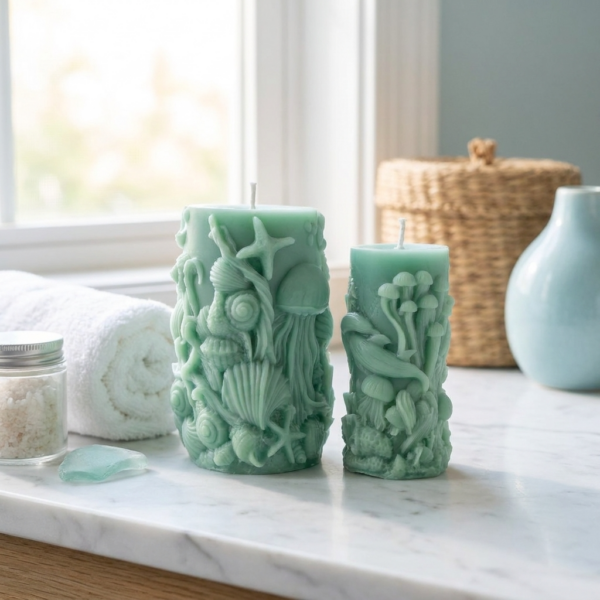 Oceanica Spa Pillar Candles feature intricate sculptural sea-life details in soft ocean greens. Scented with refreshing Oceanica Spa fragrance. Available in Large (9.2 oz) or Small (4.1 oz), or as a Duo Bundle (15% savings!). Pairs beautifully with the Oceanica Spa Wax Melts and Room Spray for a complete coastal ritual.