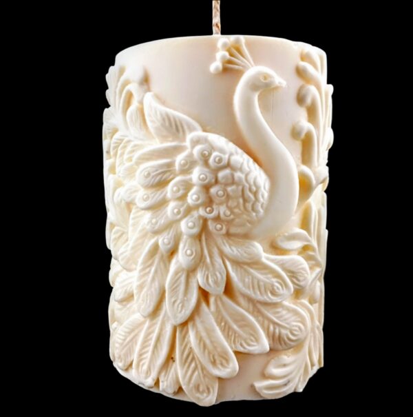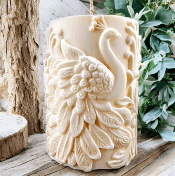 This handcrafted peacock pillar stands at 2.62-inches tall, with a 2.25-inch diameter, and has a detailed pattern featuring a peacock. These are made on-demand, but we may have one or two in stock. These candles can be made in an infinite variety of scents and colors. Enjoy a burn time for a total of approximately 31 hours*. These are made with a flat, braided cotton wick for a clean, cozy glow. Perfect for decor or gifting. Right now I am in the process of making a variety of scents and colors for each candle, but while I’m building inventory, please feel free to place a custom order, which will be made right away. Drop us a line and we will make your waxy wishes come true. angelina@theangelinastore.com