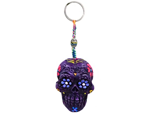 Handcrafted durepox resin figurine keychain featuring a vibrant Day of the Dead sugar skull with multicolored floral designs in a striking purple color. Handmade in Peru, this keychain includes a braided macramé cord, a large bead, and a silver metal keyring for easy attachment to keys, wallets, backpacks, or purses. Each piece is unique due to its artisanal craftsmanship and comes in assorted colors.