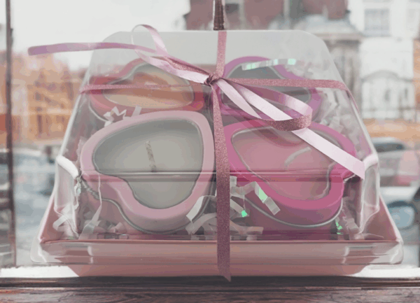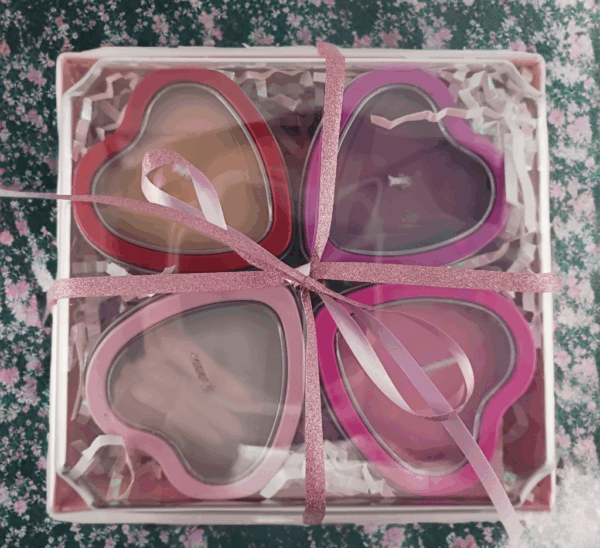 The ultimate romantic gift: four 2.5 oz heart tins (one each Quartet scent) in a pretty pink box with glittery ribbon.