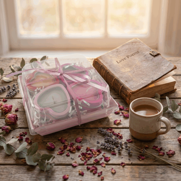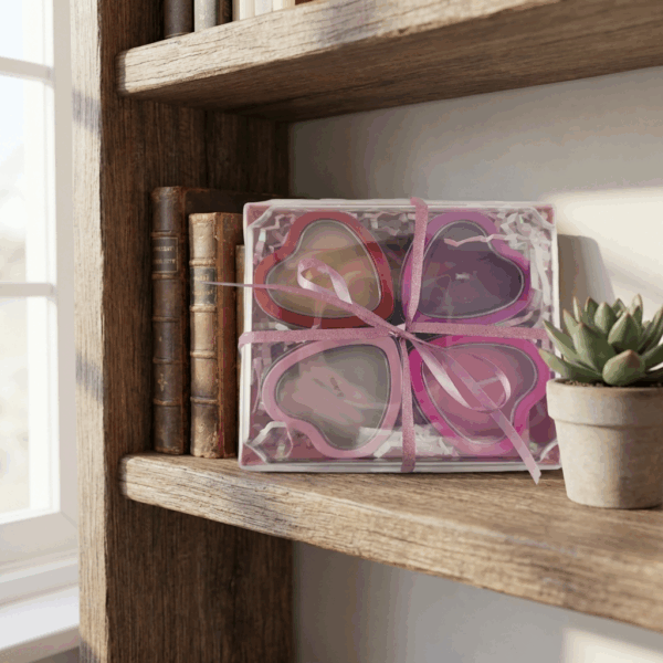 Nestled in opalescent pink krinkle fill inside a sturdy pink charcuterie-style box with clear top, tied with a glittery pink ribbon. Hand-poured in premium soy wax for clean burn and lasting fragrance. Add matching pillars, jars, or melts for layered luxury, or gift as-is for Valentine’s, anniversaries, or “just because.” The complete Romance Quartet experience, beautifully packaged!
