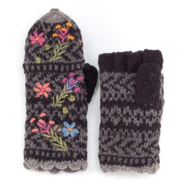 Sadie convertible wool mittens in Berries or Black color — flip-top design with embroidery for warmth and finger freedom.