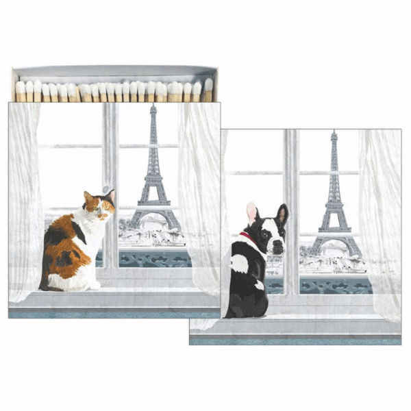 These square matchboxes from Paperproducts Design hold about 45 matches. The cover shows the cute “Madeleine & Remi A Paris” design with a stylish pair of pets set in Paris apartment with La Tour Eiffel in the background. Striker on the side. Useful around the house for lighting candles, fires, or gas burners.