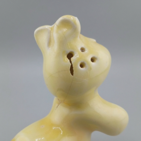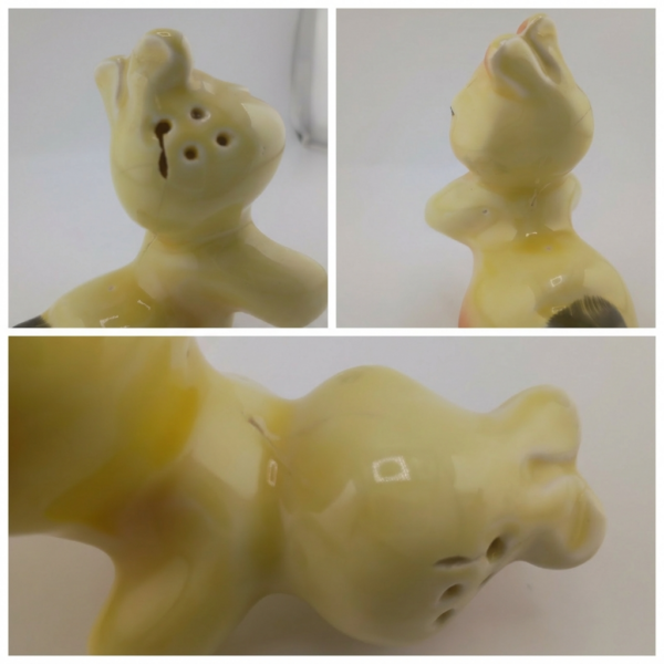 Corkless/open bases (easy fill/cleaning). Honest vintage condition: One bunny has a stable repair a (visible in close-up photos—no wobble or loose parts); no other cracks, chips, crazing, or repairs. Steep discount due to repair. Glaze remains glossy and colors vibrant overall.