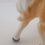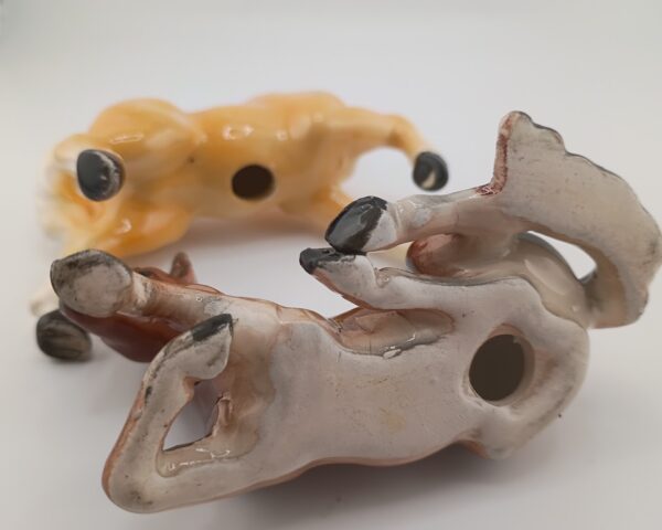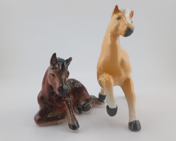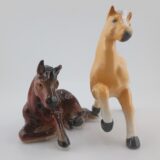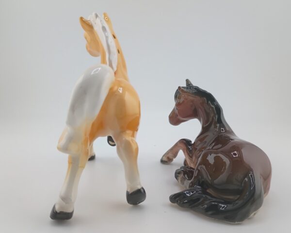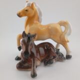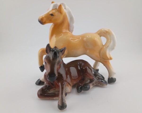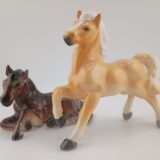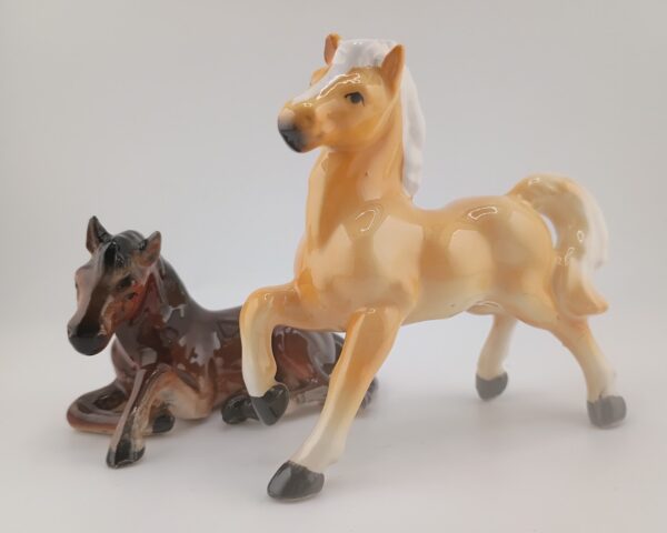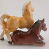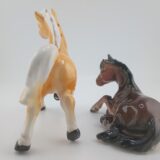 Elegant 1950s–60s Japan horses—standing palomino (3.5″ high, repaired leg in 2 places) + reclining bay. No corks, good vintage condition otherwise. Discounted collectible!