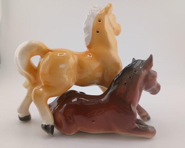 Vintage Horse Salt & Pepper Shakers Japan Mid-Century Rearing & Reclining Pair Repaired Kitsch