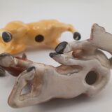 These graceful horse salt and pepper shakers capture mid-century Japan elegance! The standing palomino (creamy tan with white mane/tail, black hooves/eyes/nose) rears up proudly at ~3.5″ high, while the reclining dark bay (rich brown with black mane/tail) rests peacefully at ~2″ high. Glossy glaze and detailed sculpting make them display favorites.