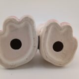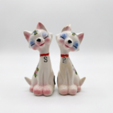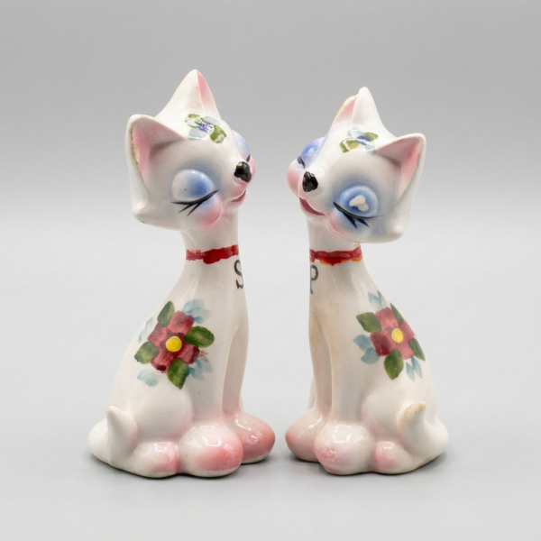 Discover this whimsical vintage magnetic cat salt and pepper shaker pair from Japan (1950s–1960s era)—they magnetically attract and stick together for that sweet “kiss” or hug pose, a demonstration of real animal magnetism! Each stands 4″ tall (2″ wide/deep), crafted in glossy white ceramic with pink-tipped ears/paws, rosy blush cheeks, black whiskers/noses, and delicate hand-painted flowers (red/pink/green/yellow blooms) on their sides. Red “collars” feature bold black “S” and “P” labels for easy use.