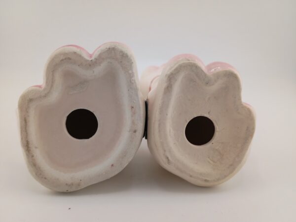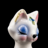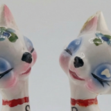 Fun vintage Japan magnetic cats—4″ tall pair with hand-painted floral details, red collars (“S”/”P”), blissful winking blue-lidded eyes, and they magnetically stick together! Minor ear/eyelid glaze chips, no corks. Adorable retro novelty!