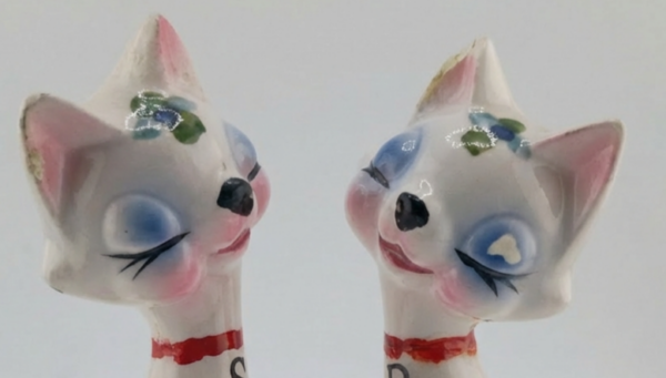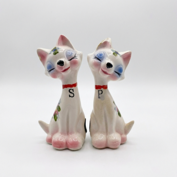 Vintage Magnetic Cat Salt & Pepper Shakers Japan Mid-Century Floral Collar Winking Eyes Stick-Together Pair 4″ Kitsch