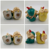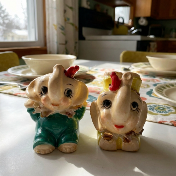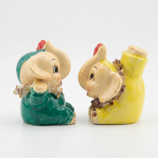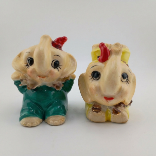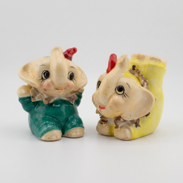 Tiny mid-century circus elephants full of joy! These pocket-sized cuties feature big expressive eyes (long lashes, one winking!), rosy cheeks, curled trunks up for good luck, red tuft “hats,” and playful outfits: one in teal/green with gold-flecked ruffled collar, the other in yellow with frilly wrap and gold accents. Hand-painted white bodies with brown shading and scalloped bases—pure 1950s–1960s Japan-import whimsy perfect for small shelves, dollhouse displays, or as sweet accents.