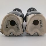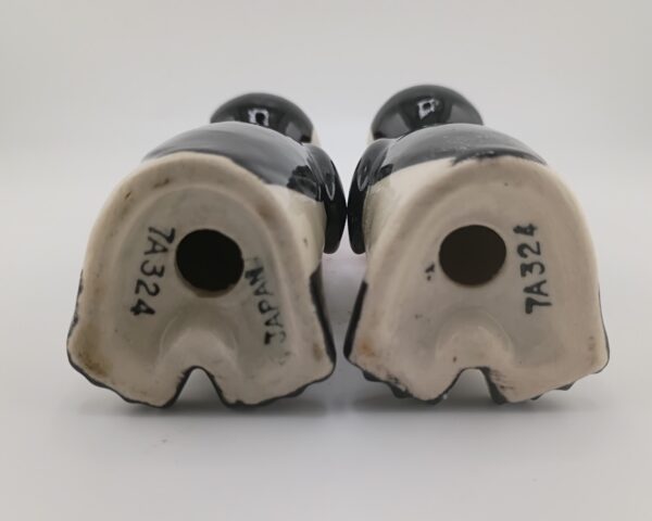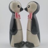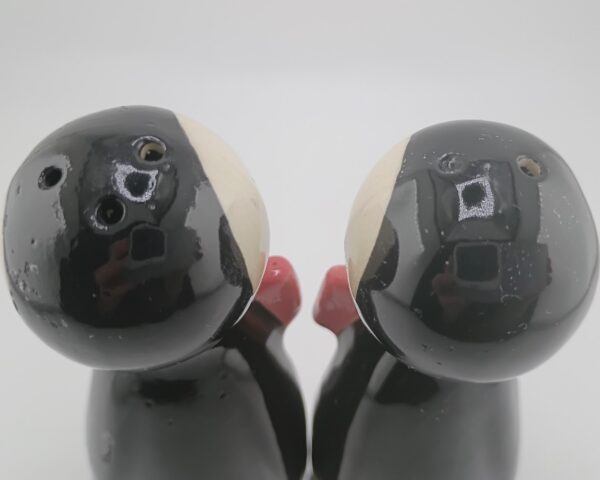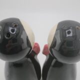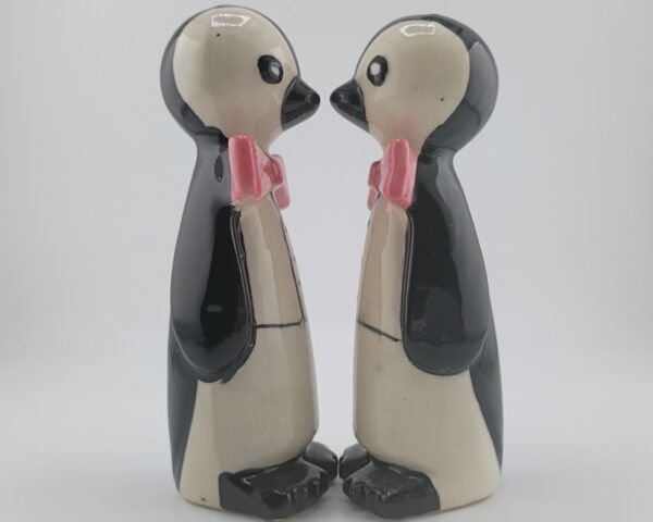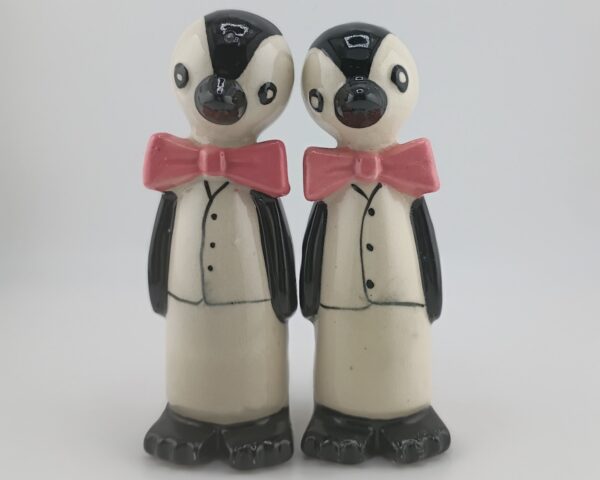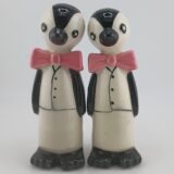 Adorable 1950s–60s Japan tuxedo penguins—5″ tall, black/white bodies, pink bow ties, big eyes. Near mint, minimal crazing, corkless. Classic retro collectible!