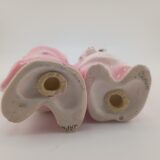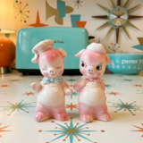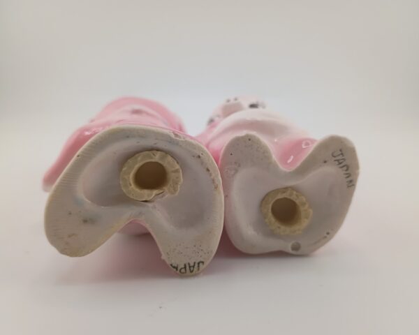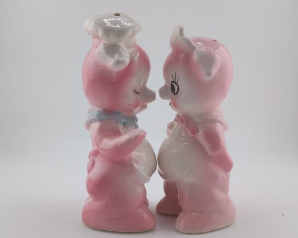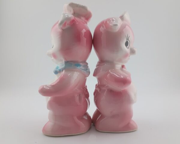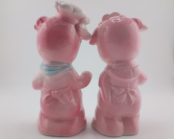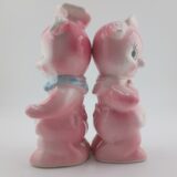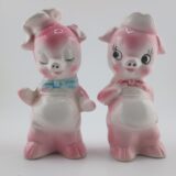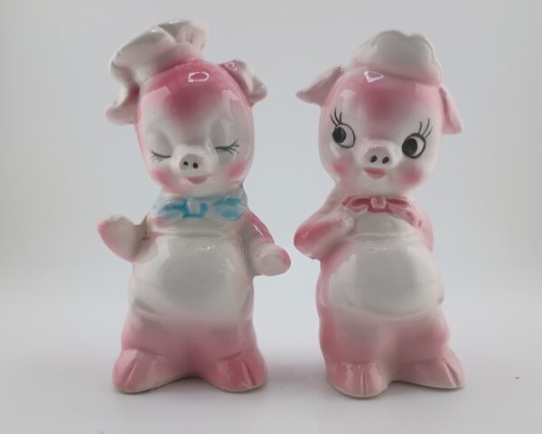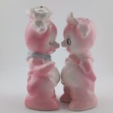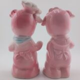 Super cute 1950s–60s Japan pink pigs in chef/apron attire—boy with blue bow & toque, girl with red bow & frilly cap. 4″ tall, near mint, original plastic stoppers (aged). Adorable retro kitchen collectible!