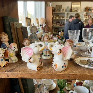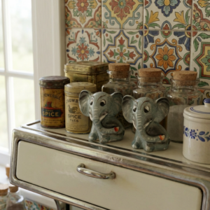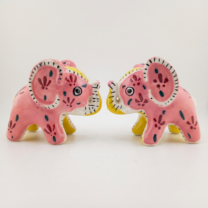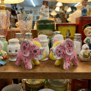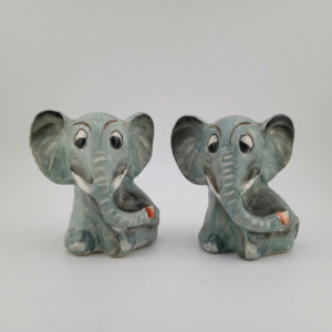 Adorable mid-century circus duo! These vibrant pink & yellow elephants are full of 1950s–1960s Japan-import charm—big expressive eyes (one winking!), trunks curled up for good luck, hand-painted teal floral ...
