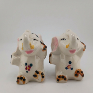 Vintage White Floral Elephants Salt & Pepper Shakers – Japan 1950s-60s, Trunk Up Luck Charms, Hand-Painted Multicolor Dots, Corkless