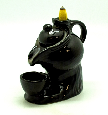 Glossy black ceramic teapot-shaped backflow burner. 5 inches tall—when a backflow cone is lit, smoke pours down from the spout in a gentle waterfall cascade, creating a calming visual and fragrant ambiance