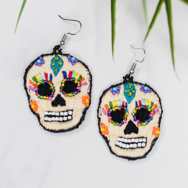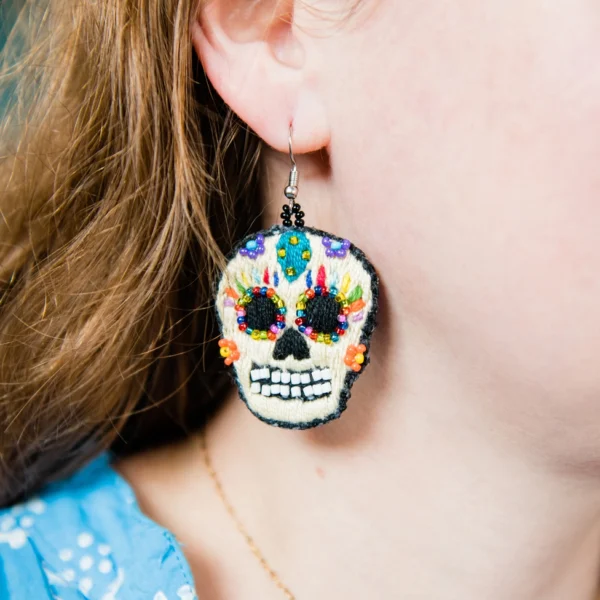 Threaded Catrina sugar skull earrings with vibrant floral designs, 2.5″ x 1.5″, made in Guatemala. Lightweight and fair trade.
