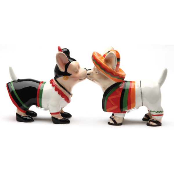 Sweet ceramic Chihuahua duo from Pacific Giftware: one in a black dress, the other in a sombrero and poncho, locked in a cute nose kiss. Fun 3.25″ x 2.5″ x 3.5″ size, high-quality build, perfect for adding playful personality to your kitchen or dining table.