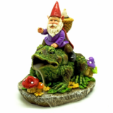 Delightful gnome riding a grinning frog backflow burner: gnome in red hat and purple tunic on a green frog with open mouth for cascading smoke. Hand-painted resin, 5.5 inches tall—adds enchanting, playful magic to any space.