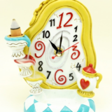 Charming Alice-inspired Mad Tea Party clock and backflow burner from cold-cast resin: melted clock face, teacup, candlestick, and checkerboard base. 7″ tall x 5″ wide, hand-painted—works as a real clock (AA battery not included) and creates a cascading smoke waterfall when lit with a backflow cone.