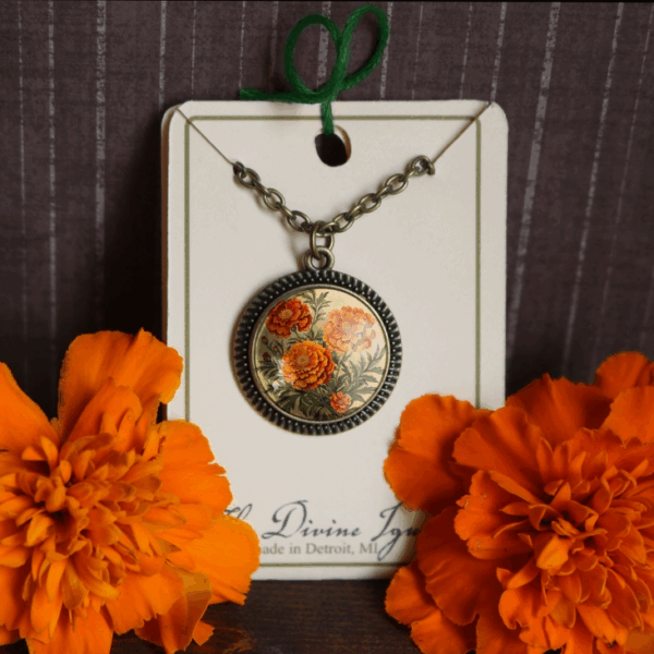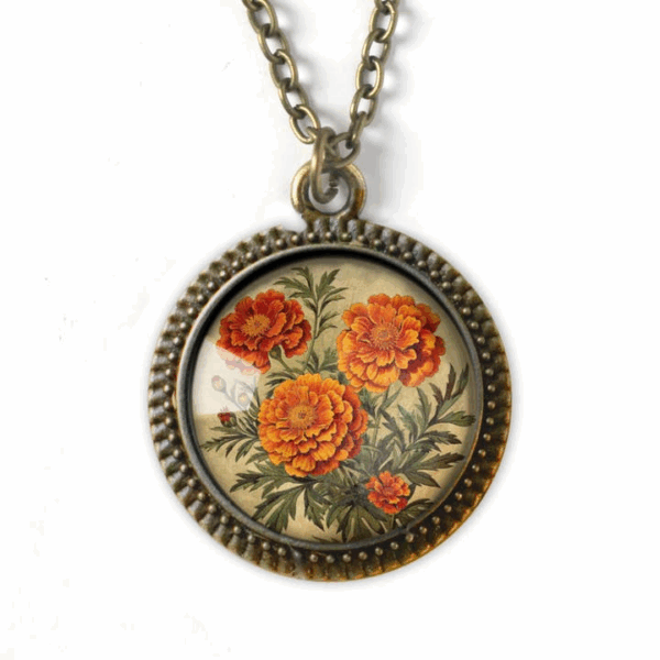 The Divine Iguana’s Marigold Flowers Large Pendant Necklace is a true cottagecore treasure. Handcrafted with vibrant pressed marigold blooms carefully sealed under a generous glass cabochon and set in warm bronze, this oversized pendant hangs from an adjustable chain for comfortable all-day wear. The rich orange and gold tones evoke sunny fields and harvest seasons, making it ideal for layering with sweaters, dresses, or boho outfits. Each piece is unique due to natural flowers, offering one-of-a-kind charm that’s both eco-conscious and eternally stylish. Perfect as a fall jewelry staple or meaningful gift.