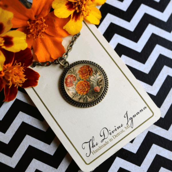 Stunning large pendant necklace featuring real pressed marigold flowers in glass — a bold cottagecore statement piece celebrating fall’s warm golden hues.