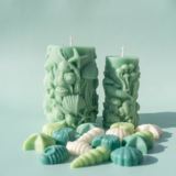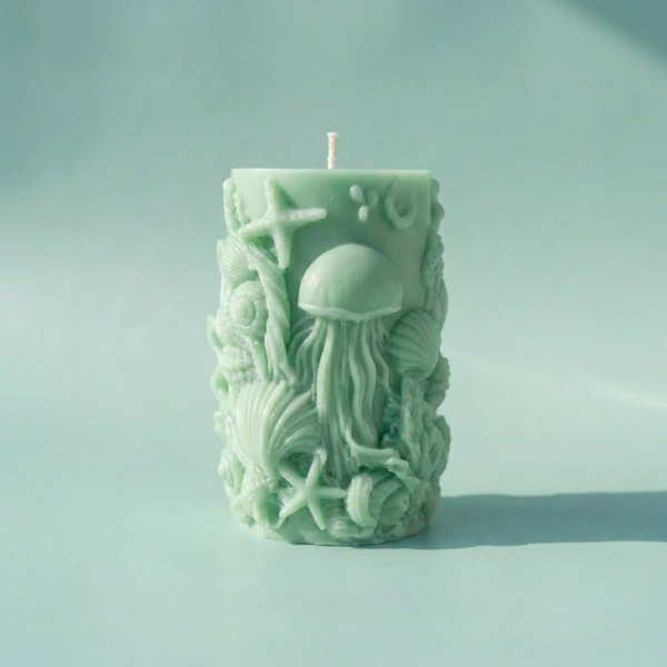 These Oceanica Spa Pillar Candles are hand-poured with intricately sculpted ocean treasures — jellyfish, starfish, seashells, coral, seaweed, and more — that beautifully emerge as the candle burns.