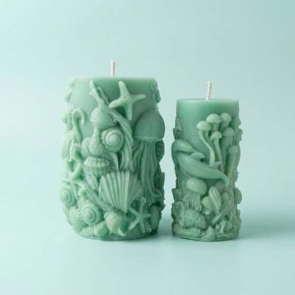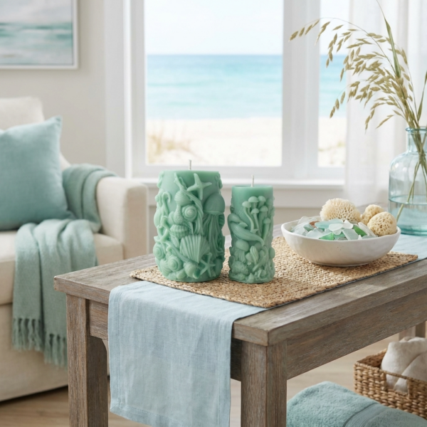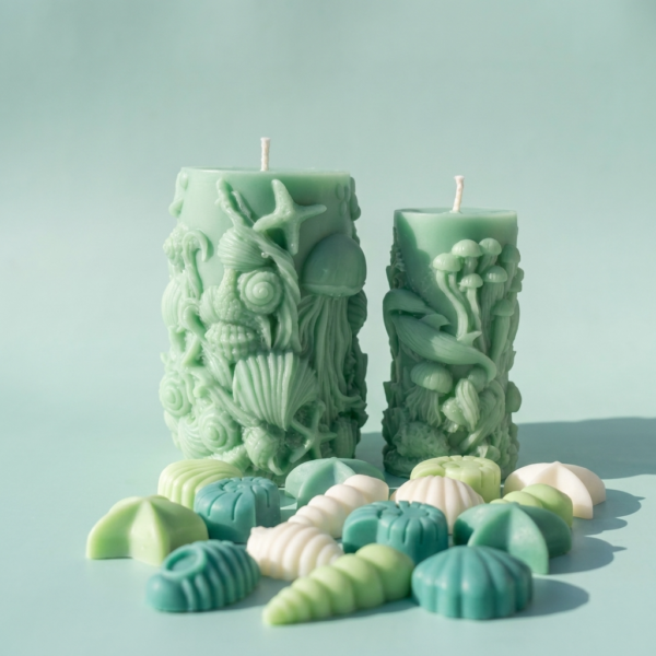 Oceanica Spa Pillar Candles feature intricate sculptural sea-life details in soft ocean greens. Scented with refreshing Oceanica Spa fragrance. Available in Large (9.2 oz) or Small (4.1 oz), or as a Duo Bundle (15% savings!). Pairs beautifully with the Oceanica Spa Wax Melts and Room Spray for a complete coastal ritual.