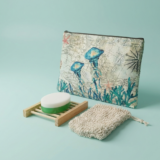 Oceanica Spa Signature Soap Set includes a two-tone green & white glycerin soap (~3 oz), bamboo soap rack, reusable soap saver bag, and a beautiful ocean-themed canvas zipper pouch. Gentle, refreshing, and perfectly giftable coastal self-care.