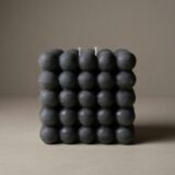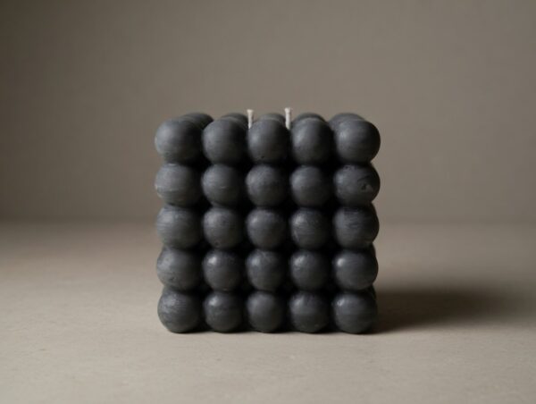 This 3.25″ × 3.25″ × 3.25″ soy wax cube is a one-pound, 5×5 grid of fused spheres—25 orbs forming a near-void-black monolith. Three cotton wicks rise like quantum threads for an even, harmonious burn.