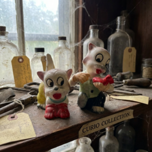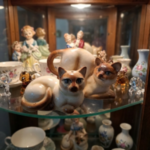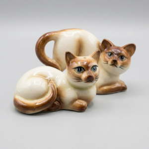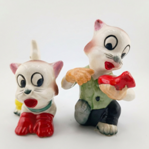 These graceful horse salt and pepper shakers capture mid-century Japan elegance! The standing palomino (creamy tan with white mane/tail, black hooves/eyes/nose) rears up proudly at ~3.5″ high, while the reclining dark bay (rich brown with black mane/tail) rests peacefully at ~2″ high. Glossy glaze and detailed sculpting make them display favorites.