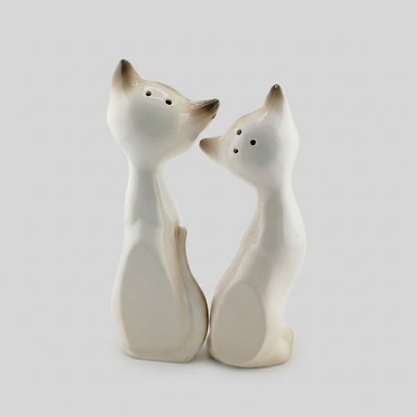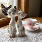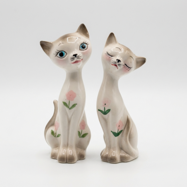 Adorable vintage Japan Siamese cat salt & pepper shakers – the tallest is 6″, with blue eyes, pink flowers, mid-century kitsch charm. Minor ear chips, corkless.