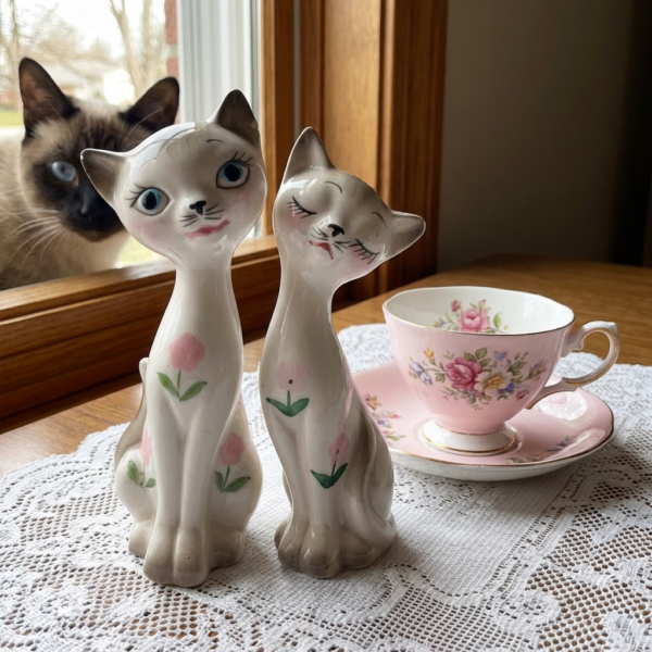 Add a touch of mid-century whimsy to your kitchen or collection with this charming vintage Siamese cat salt and pepper shaker pair, made in Japan during the 1950s–1960s era. Standing tall at 6″ (the open-eyed one with a sweet smile) and 5.5″ (the blissful closed-eyes tilt), these creamy white ceramic cats feature classic seal-point coloring, big sparkling blue eyes, rosy blush cheeks, delicate black whiskers, and hand-painted pink flowers with green leaves on their bodies—pure retro kitsch perfection!