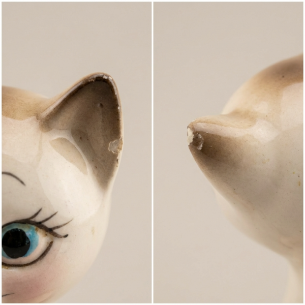 Honest vintage condition: Small chips/nicks to the ears (taller cat: nick on left ear + tiny one on right; smaller cat: nick on left ear)—clearly shown in close-up photos. No cracks, crazing, major damage, or repairs—just typical gentle wear from age and love that adds to their character. These larger-scale cats stand out beautifully on a shelf, curio cabinet, or breakfast table.Perfect for vintage kitchen decor, cat enthusiasts, or as a thoughtful gift.