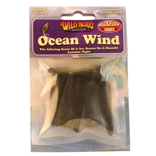 Wildberry Ocean Wind backflow cones capture a cool, alluring sea breeze on a moonlit autumn night: fresh oceanic air, salty herbs, and soft aquatic florals. Pack of 6 hand-dipped cones (Made in USA)—creates a mesmerizing downward smoke waterfall for a serene, coastal vibe.